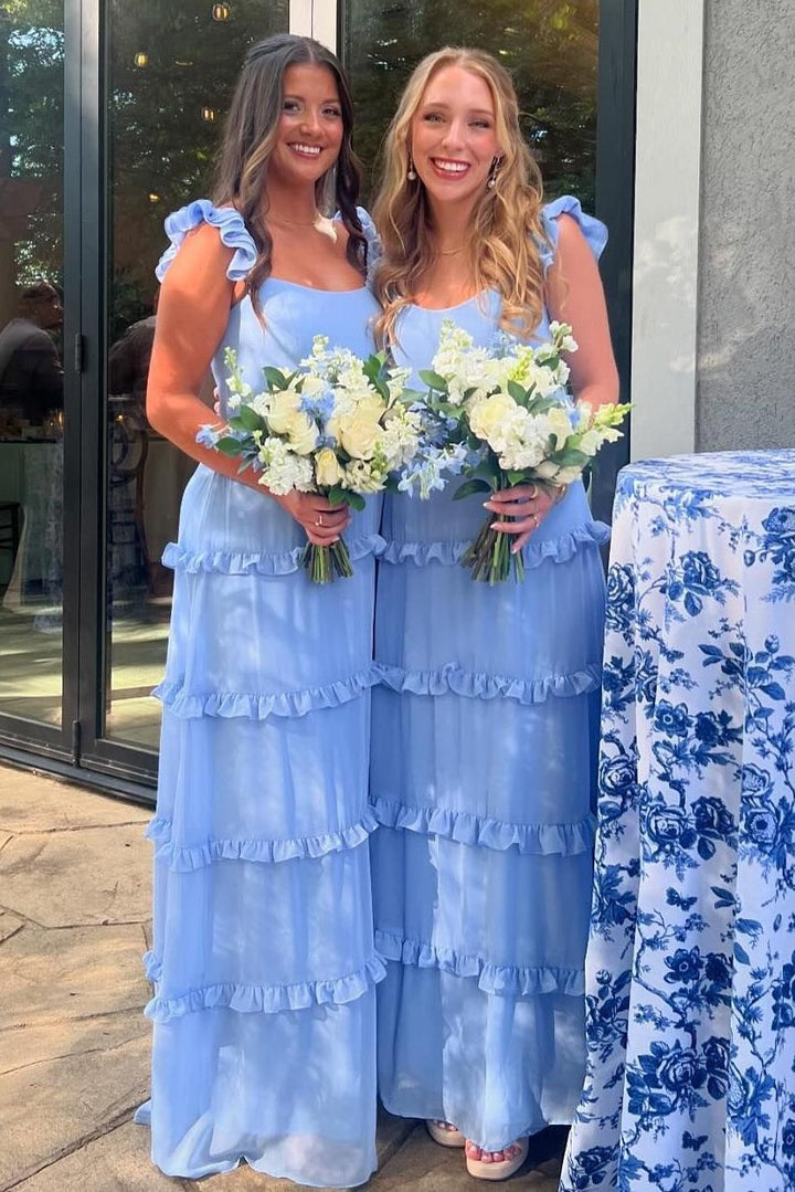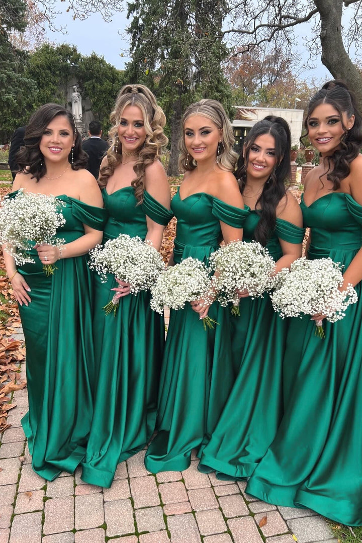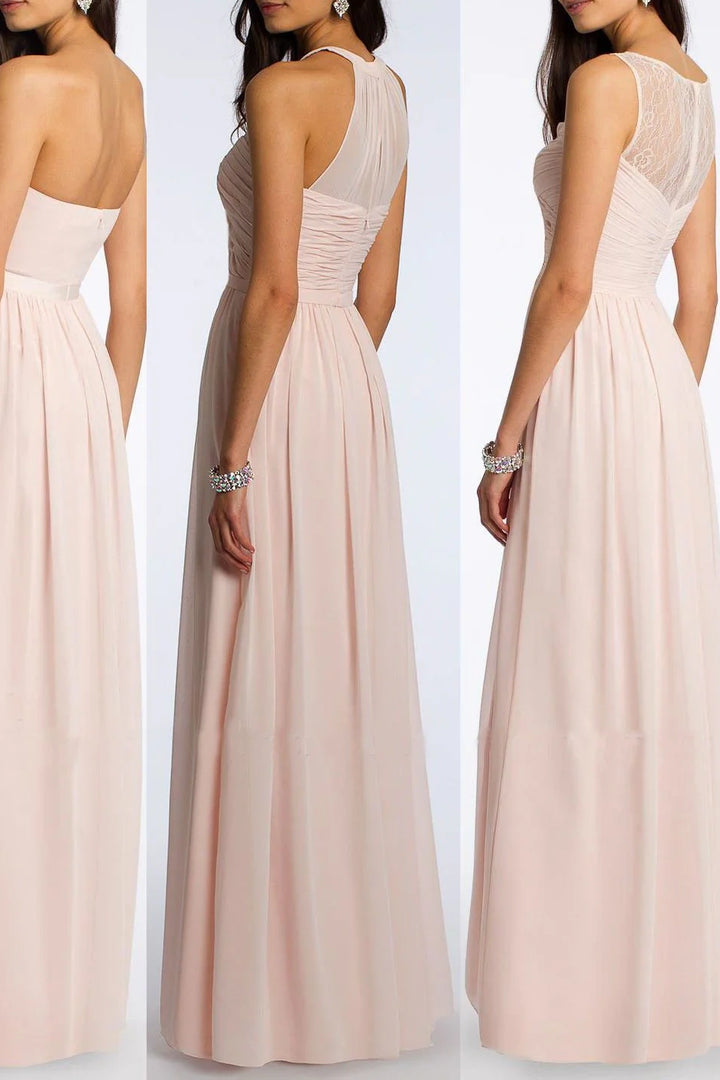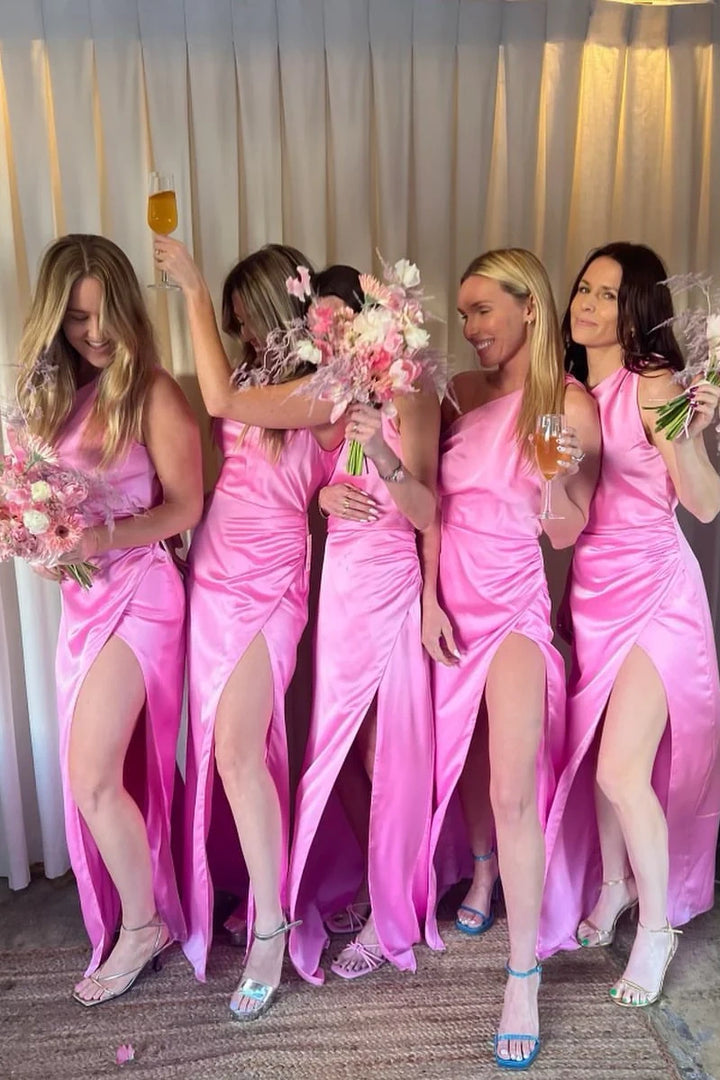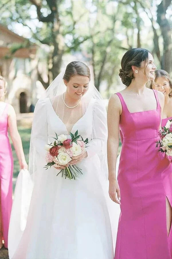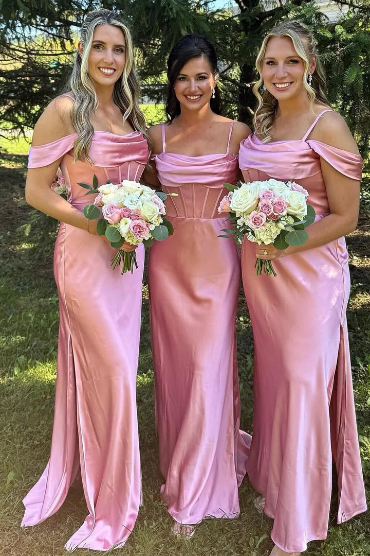 Pink V-Neck Short Sleeves Satin Long Bridesmaid Dress With Slit