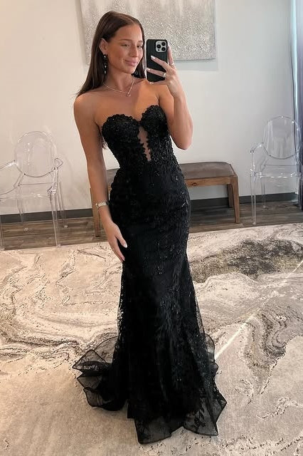 Black Lace Mermaid Sweetheart Strapless Long Party Prom Dress