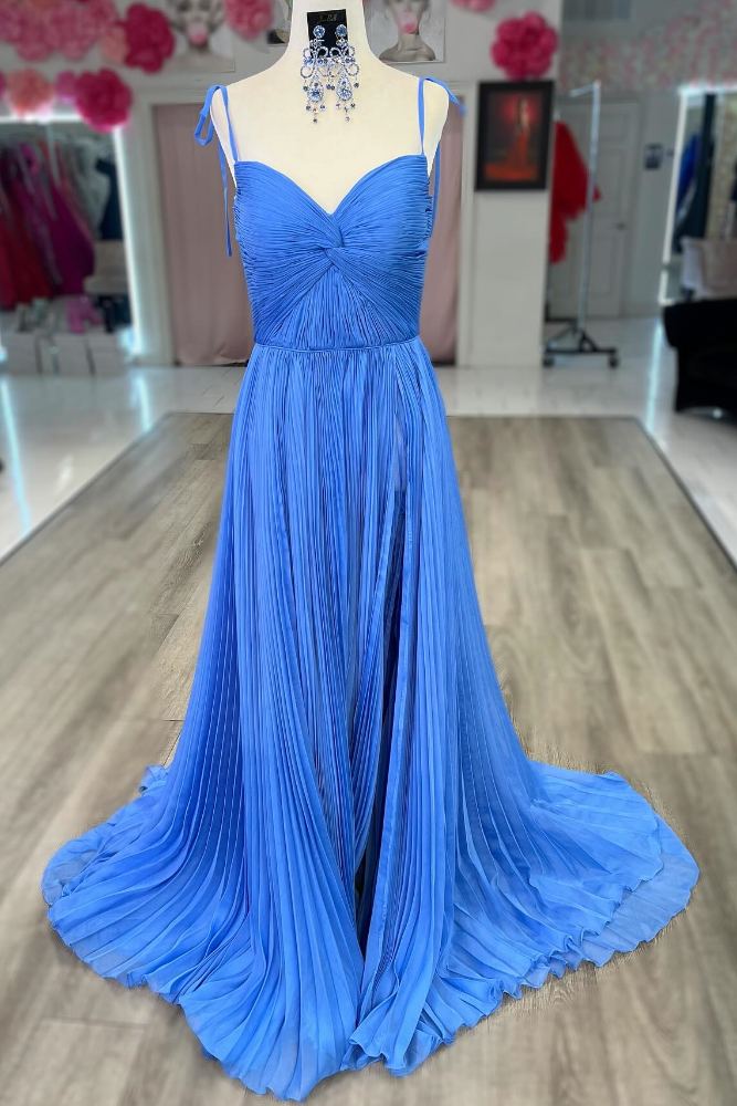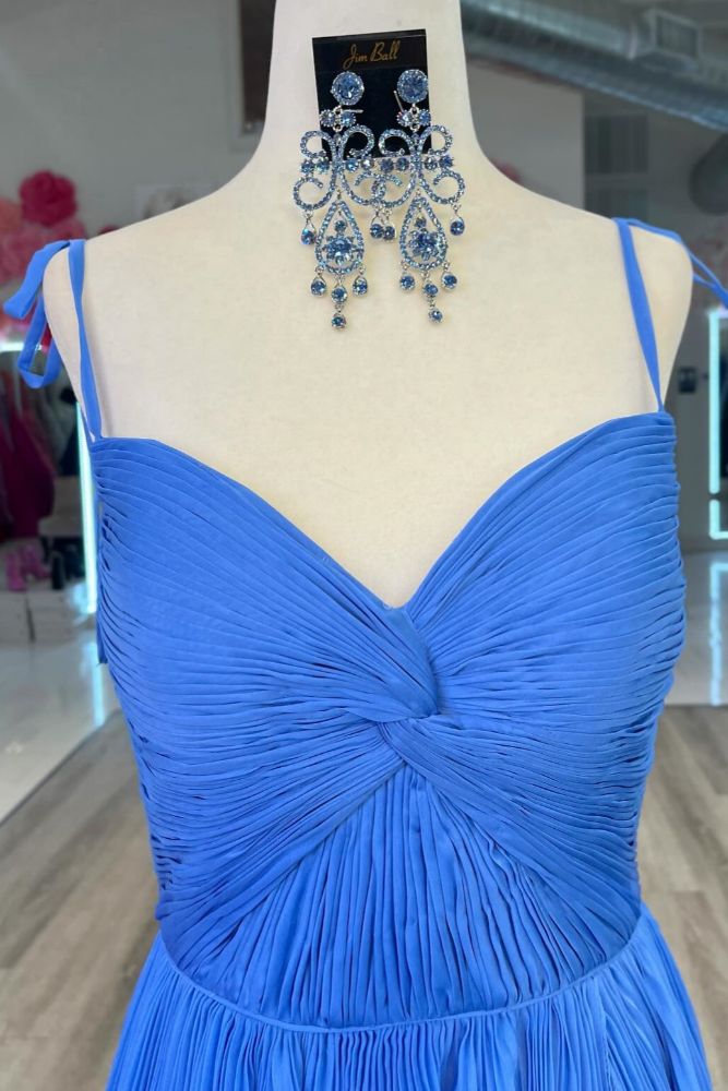 Introducing our Blue Straps Twist Knot Pleated Prom Dress, perfect for making a statement at your next formal event. With its unique twist knot design and flattering pleats, this dress is both stylish and comfortable. Stand out from the crowd and feel confident in this stunning dress.