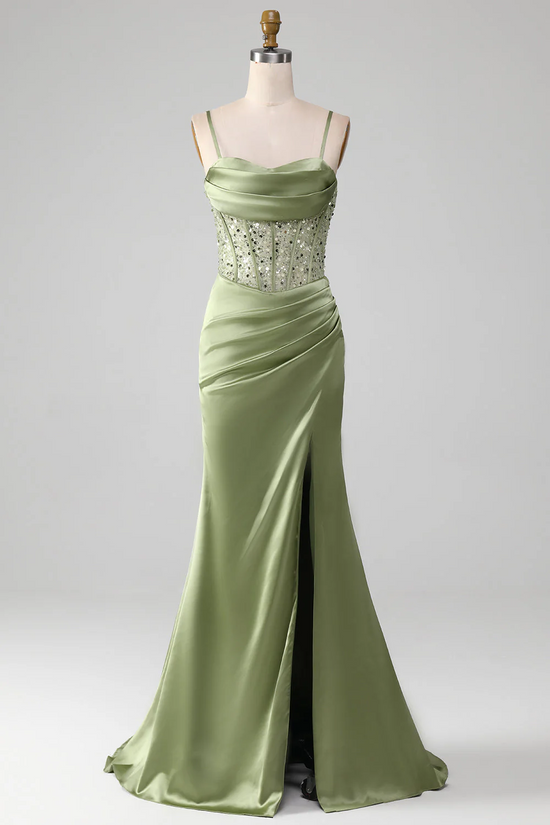 Casual Satin Trumpet Sweetheart Spaghetti Straps Sequins Draped Long Prom Dress