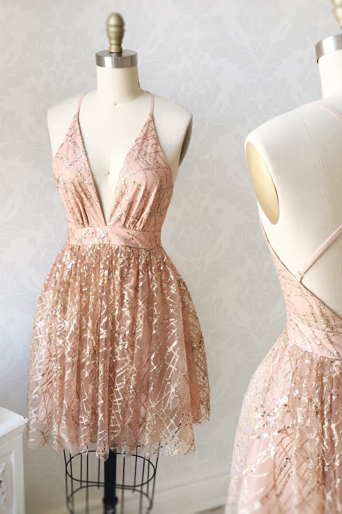 Champagne Plunging Neck A-Line Bridesmaid Dress