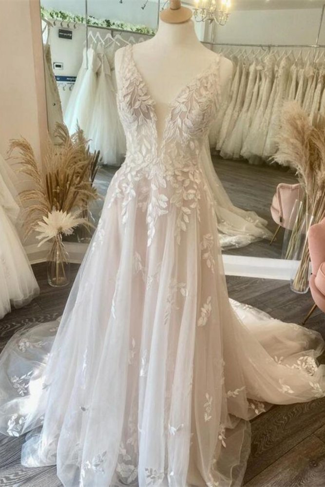 This elegant and sophisticated Champagne Plunging Neck Applique Long Wedding Dress is the perfect choice for your special day. The plunging neckline adds a touch of allure, while the intricate applique detailing adds a luxurious and feminine touch. Feel confident and beautiful while walking down the aisle in this stunning dress.