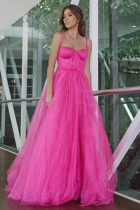 This Prom Dress features a beautiful A-line silhouette with a sweetheart neckline and delicate spaghetti straps. The tulle fabric adds a touch of sweetness to this elegant design. Perfect for prom or any special occasion.
