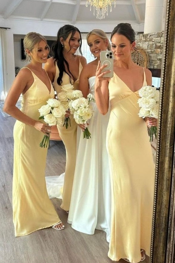 Sexy Satin Fitted V-Neck Spaghetti Straps Bridesmaid Dress