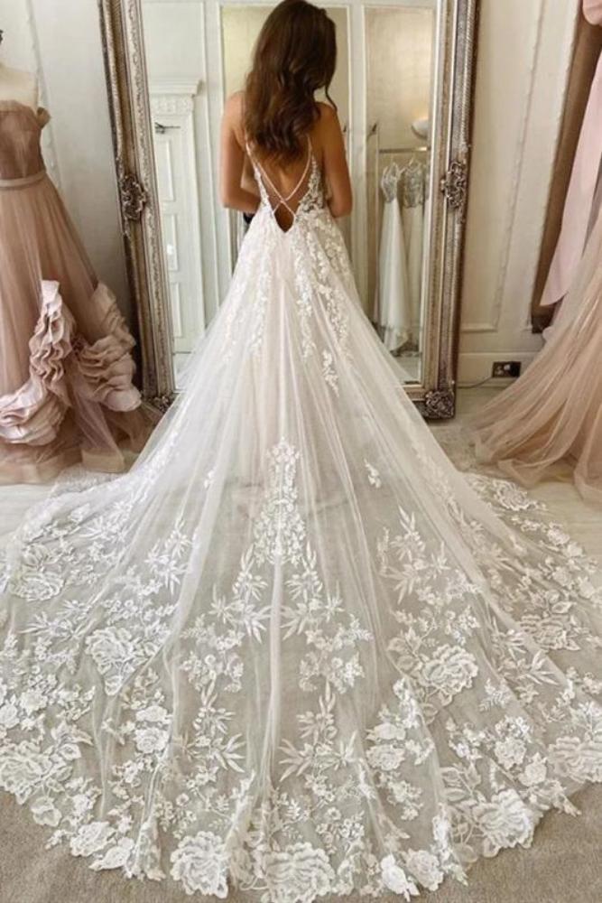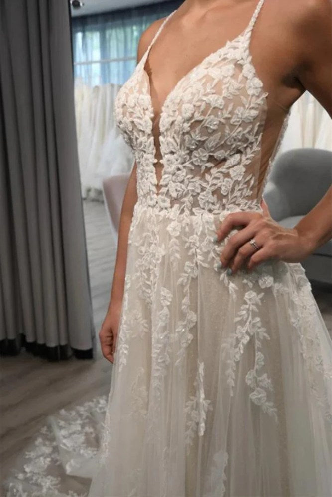 Ivory Plunging Neck Applique Bridal Dress with Open Back