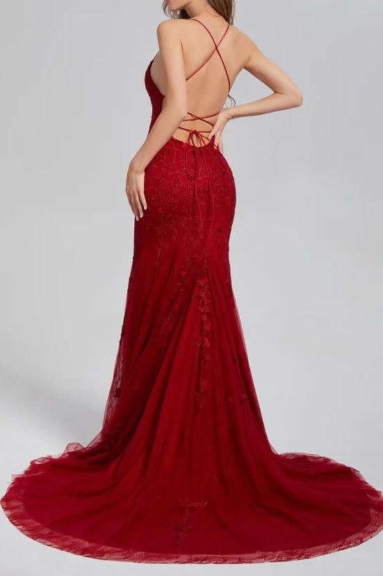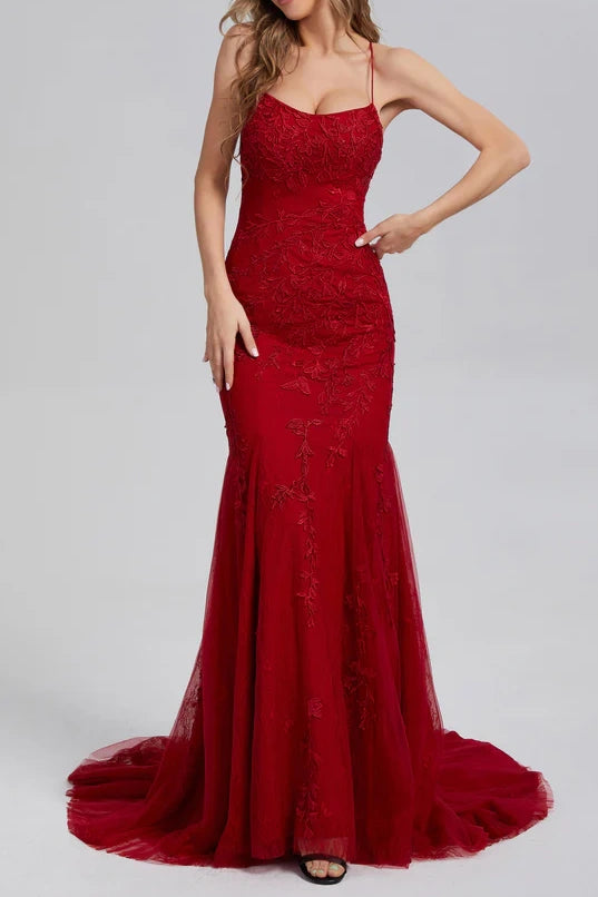 Mermaid Lace Appliques Bateau Lace Up Prom Dress