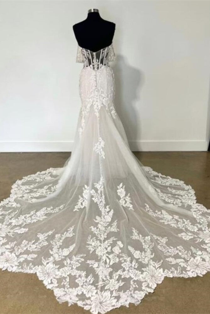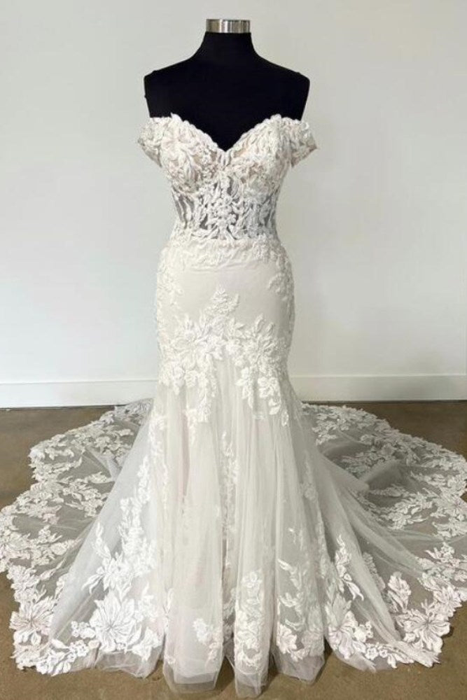 Elevate your wedding look with our Off the Shoulder White Applique Wedding Dress. Featuring a romantic off-the-shoulder neckline and delicate applique detailing, this dress is perfect for a modern and elegant bride. The train adds a touch of drama, making you feel like a true princess on your special day.