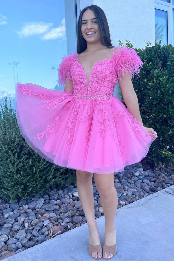 Pink Off-the-Shoulder Appliques A-line Homecoming Dress with Feathers