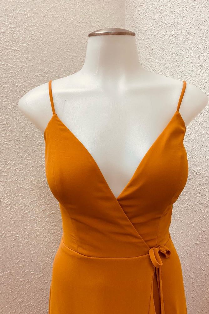 Pumpkin V-Line Ruffle Bridesmaid Dress with Slit