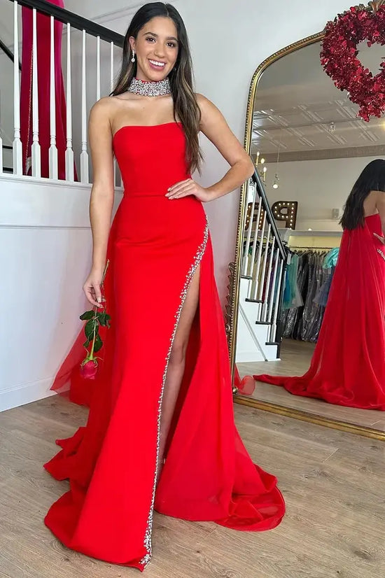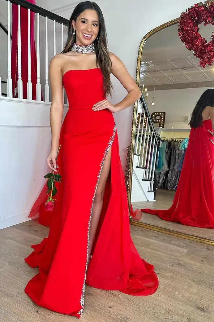 Red Mermaid Strapless High Slit Beaded Party Prom Dress