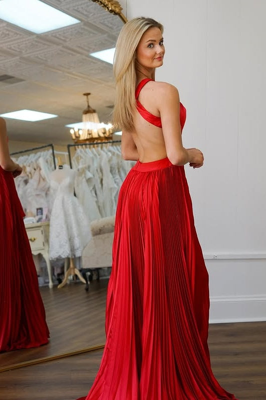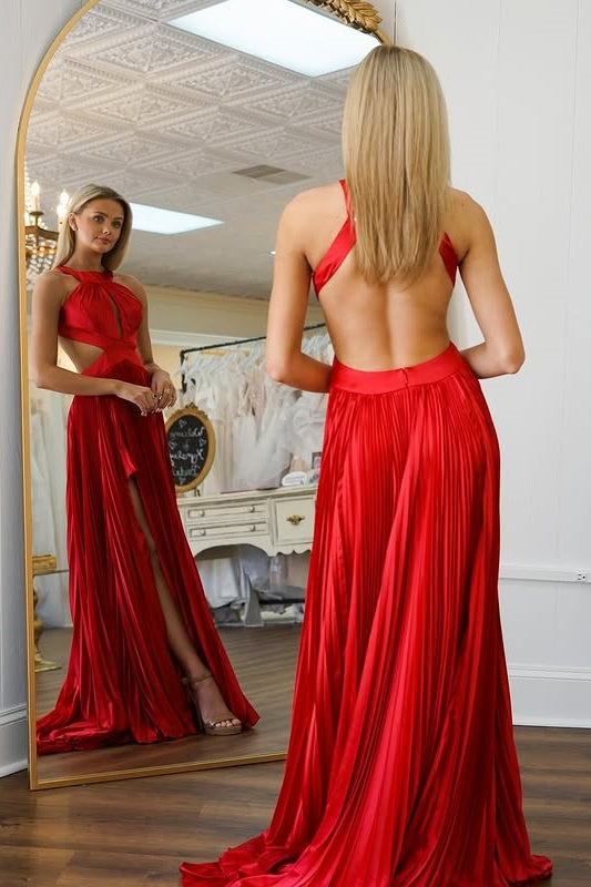 Red Satin A-Line High Neck Backless Long Party Prom Dress