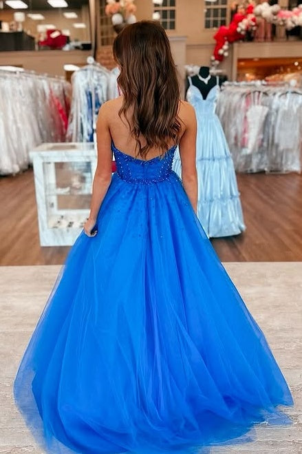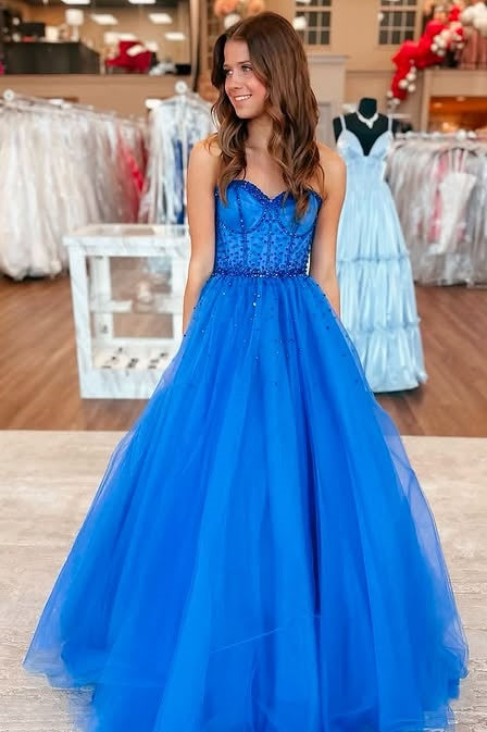 Royal Blue Sweetheart Sleeveless Beaded Tulle A-Line Prom Dress
