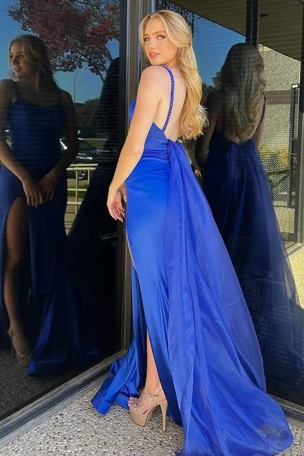 Satin Spaghetti Straps Party Prom Dress With Train And High Slit