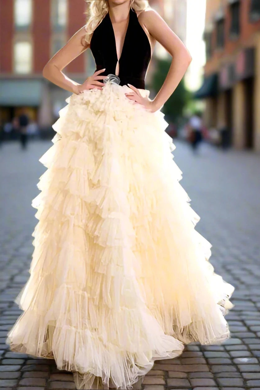 This stunning two tone prom dress features a sleek and sexy V-neck halter top and a flattering open back design. Perfect for a night of elegance and charm, this dress will make you feel confident and alluring. A must-have for any special occasion.