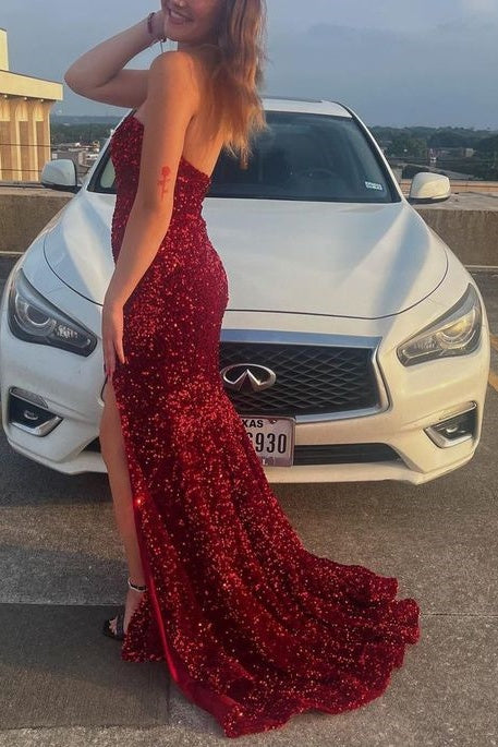 Experience elegance and fashion with our Strapless Empire Sequins Prom Dress. The side slit adds a touch of sophistication and allows for easy movement while the empire waistline flatters your figure. With stunning sequins and a strapless design, this dress will make you feel like a glamorous star on your special night.