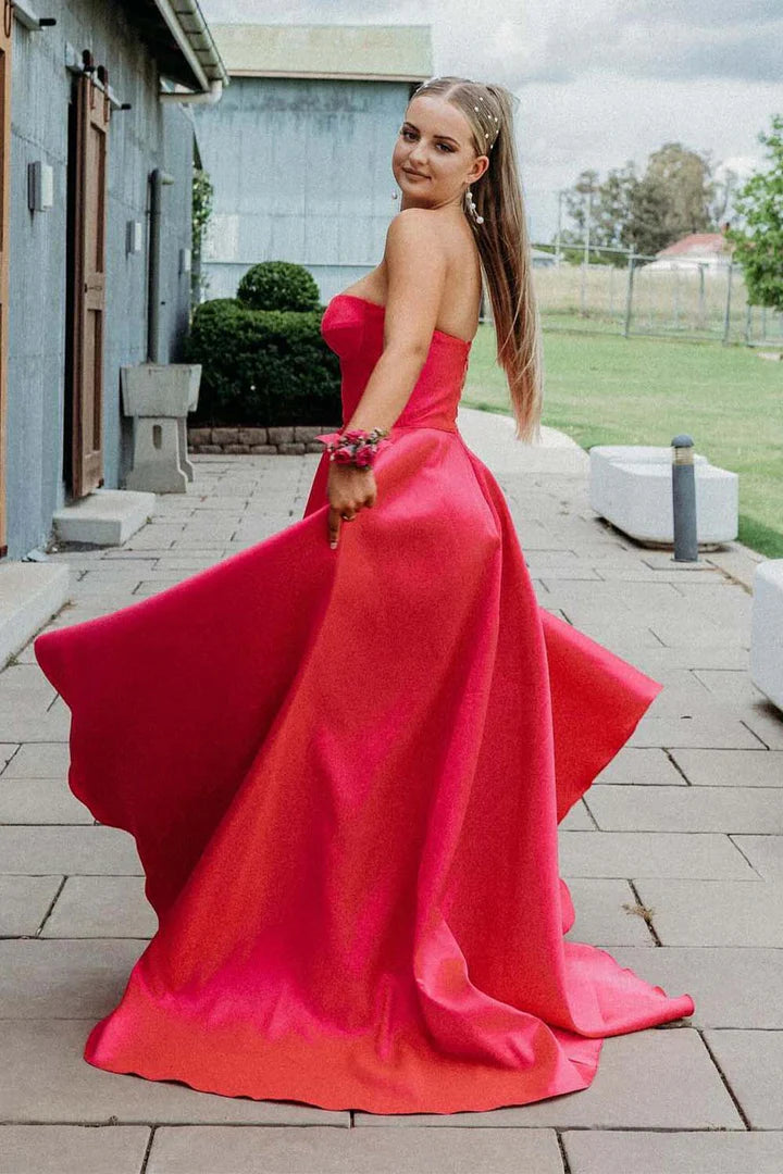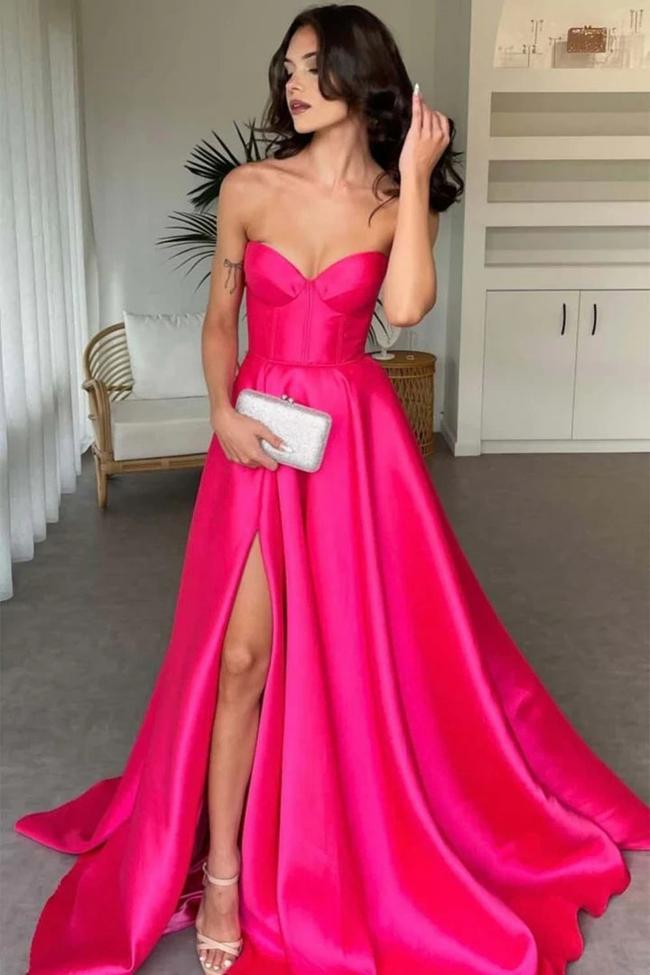Sweetheart Strapless Satin A-Line Party Prom Dress With Slit