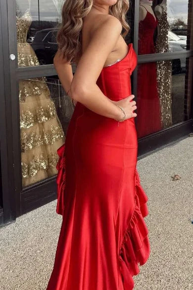 Sweetheart Strapless Satin Party Prom Dress With Ruffled Train