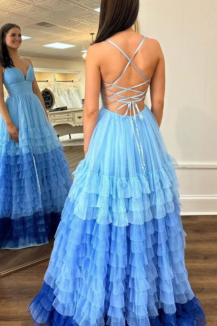 Tulle A-Line V-Neck Spaghetti Straps Tiered Long Formal Prom Dress