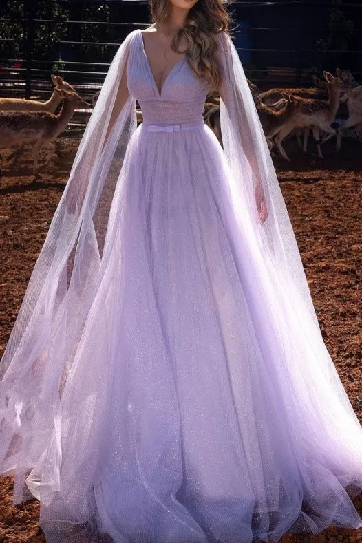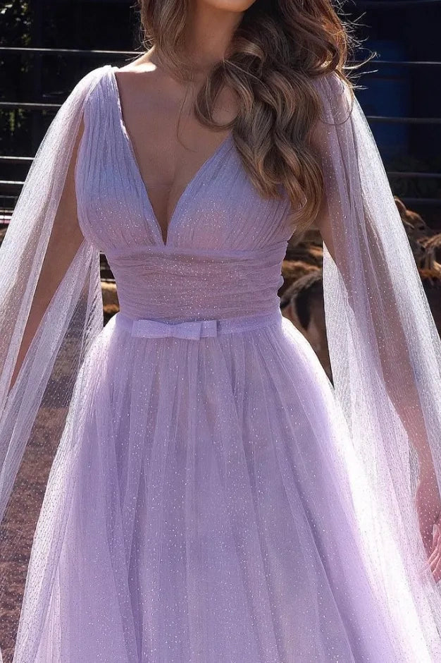 V-Neck Long Sleeves Tulle A-Line Prom Dress