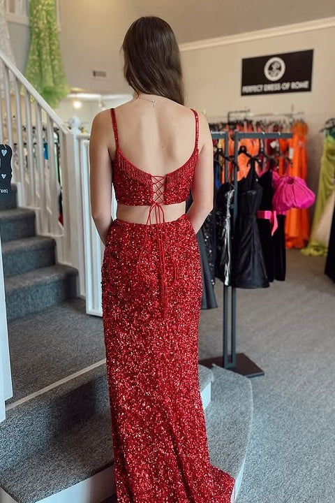 V-Neck Sleeveless Two Piece Mermaid Sequins Party Prom Dress