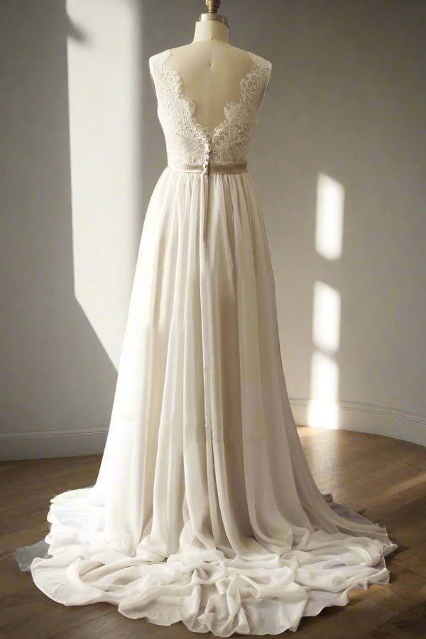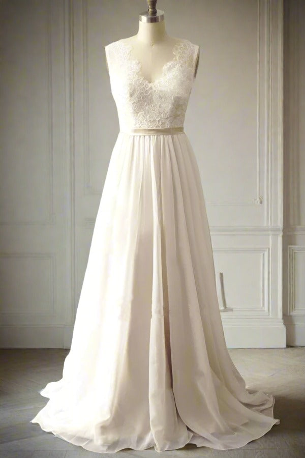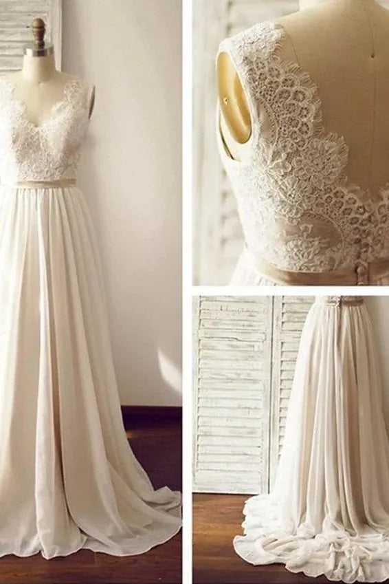 White V-Neck Lace A-Line Long Wedding Dress